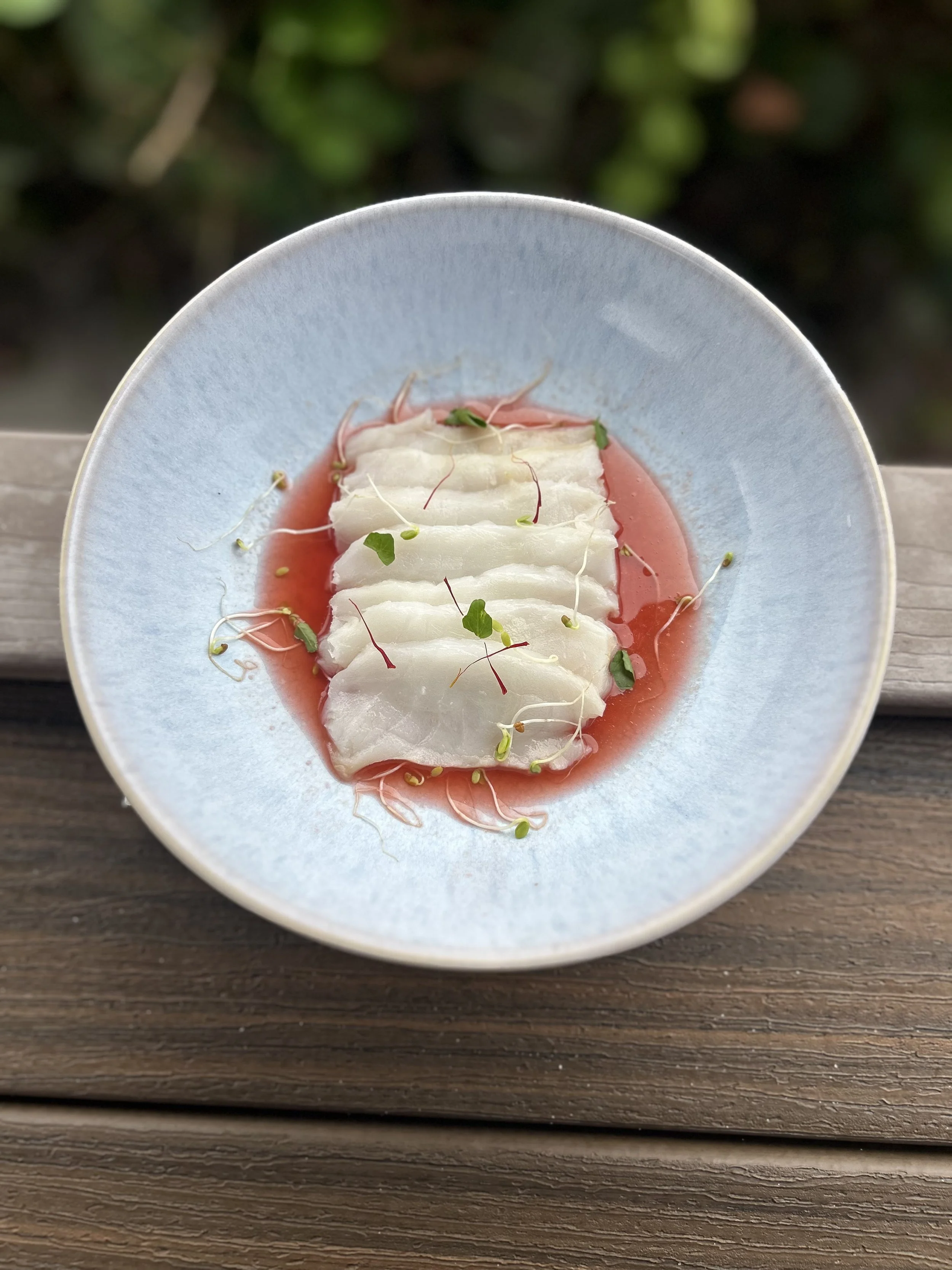 Sea bass, citrus passion fruit, green oil, topped with microgreens.